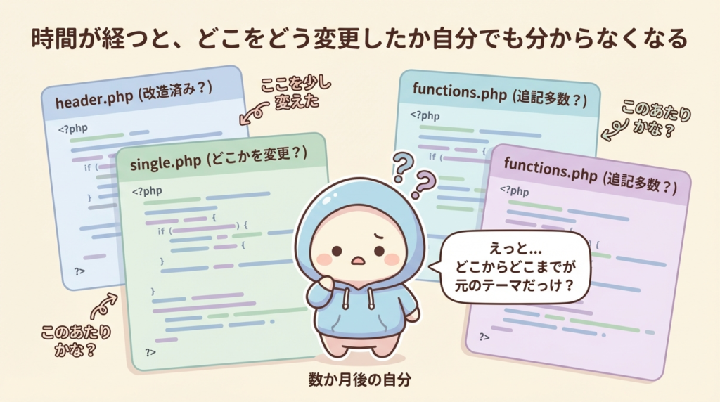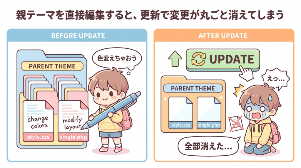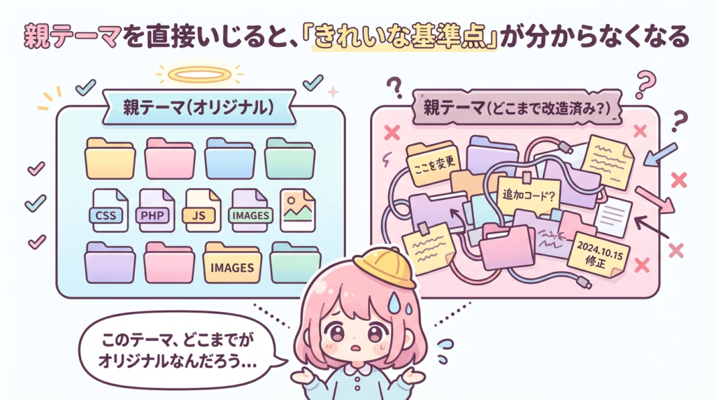 子テーマの話に入る前に、「そもそも親テーマを直接いじると何がまずいのか」をはっきりさせておきます。ここを押さえておくと、「子テーマを使う必然性」が腑に落ちます。
