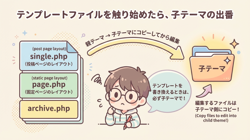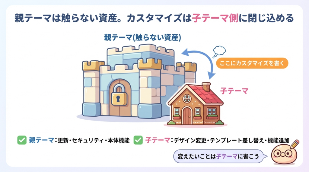 子テーマ側の変更はそのまま残ります。 - カスタマイズの“責任範囲”がはっきりする