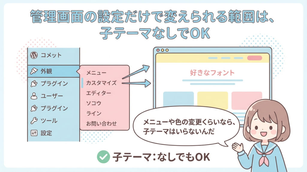 - 親テーマのアップデート → 機能やセキュリティは最新のまま