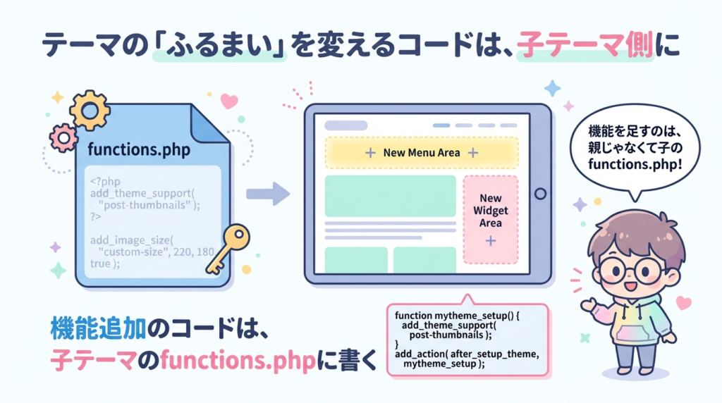 - 親テーマを更新しても、自分の追加機能が失われない