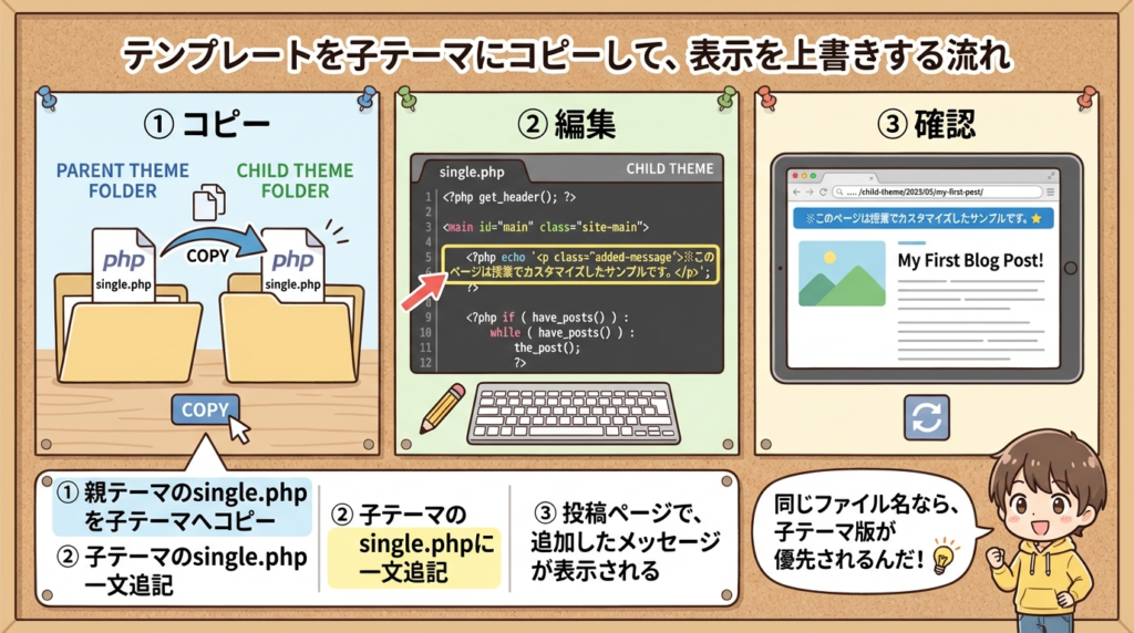 → この場合は、再び親テーマ側のsingle.phpの内容が使われます