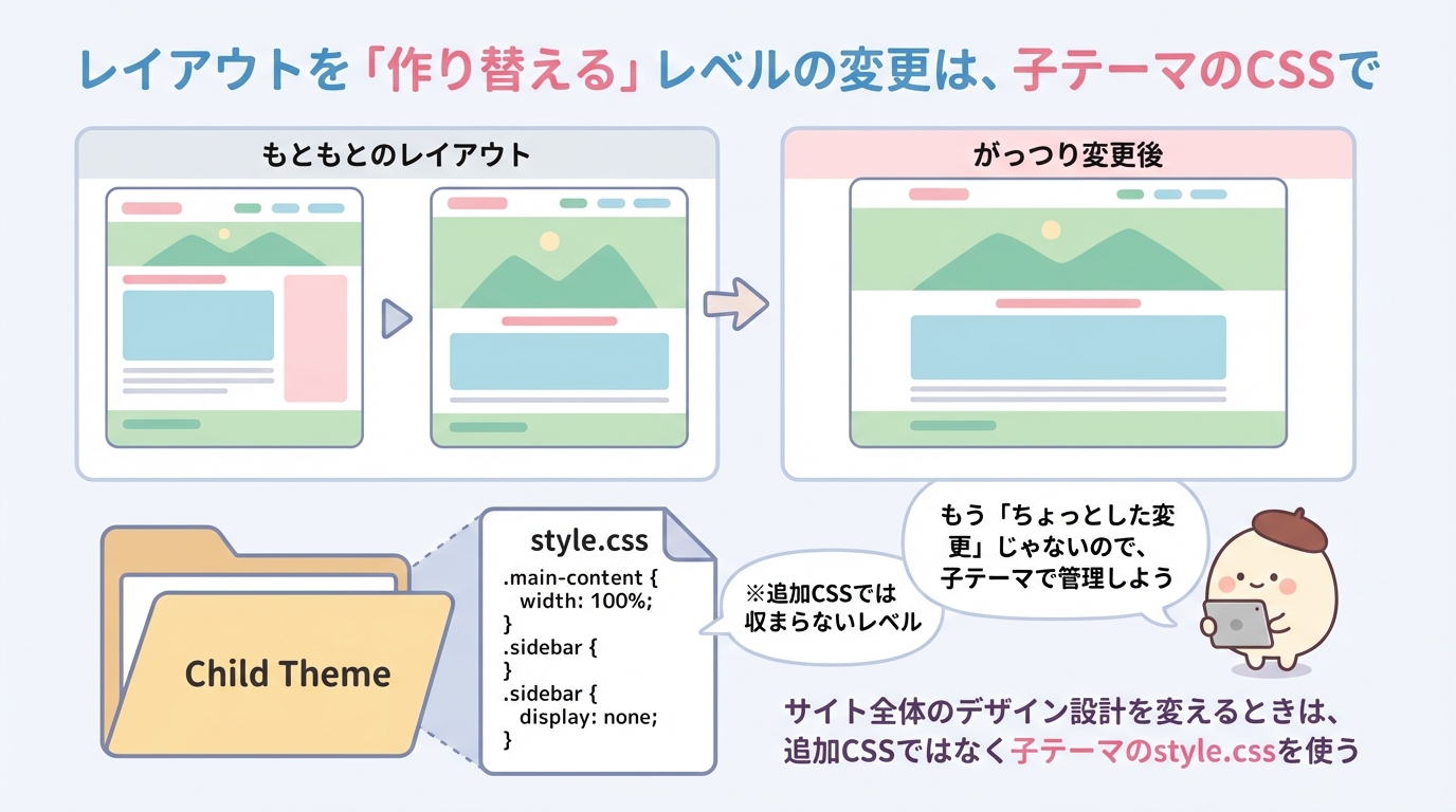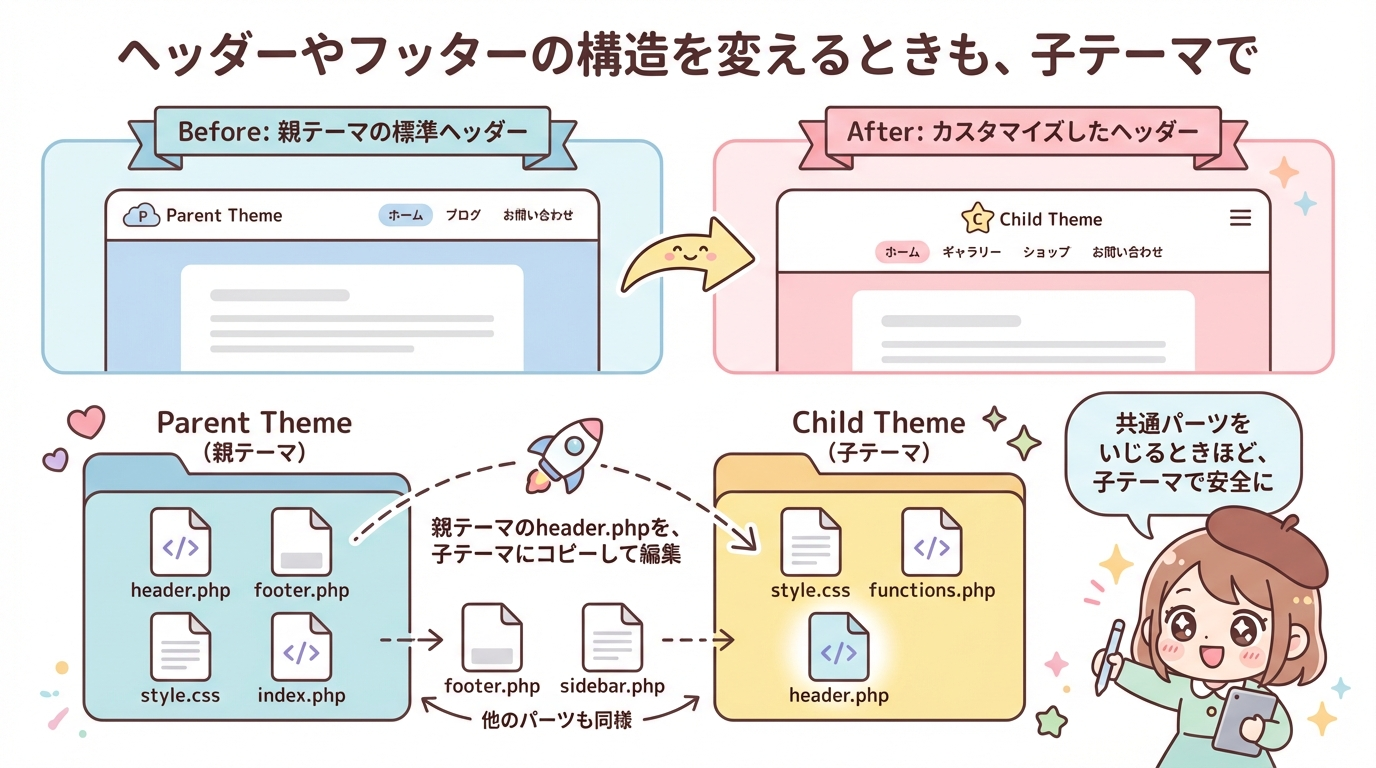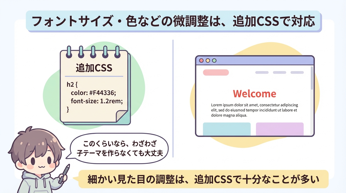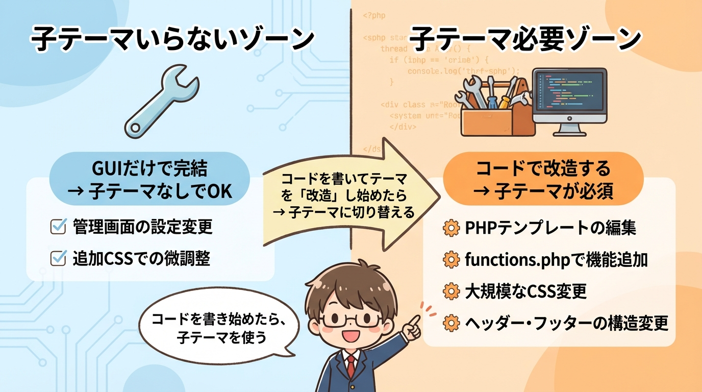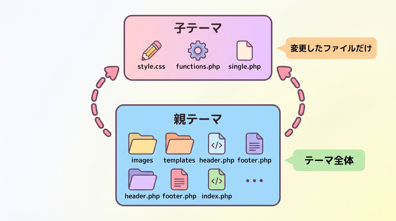 子テーマ側の変更はそのまま残ります。 - カスタマイズの“責任範囲”がはっきりする