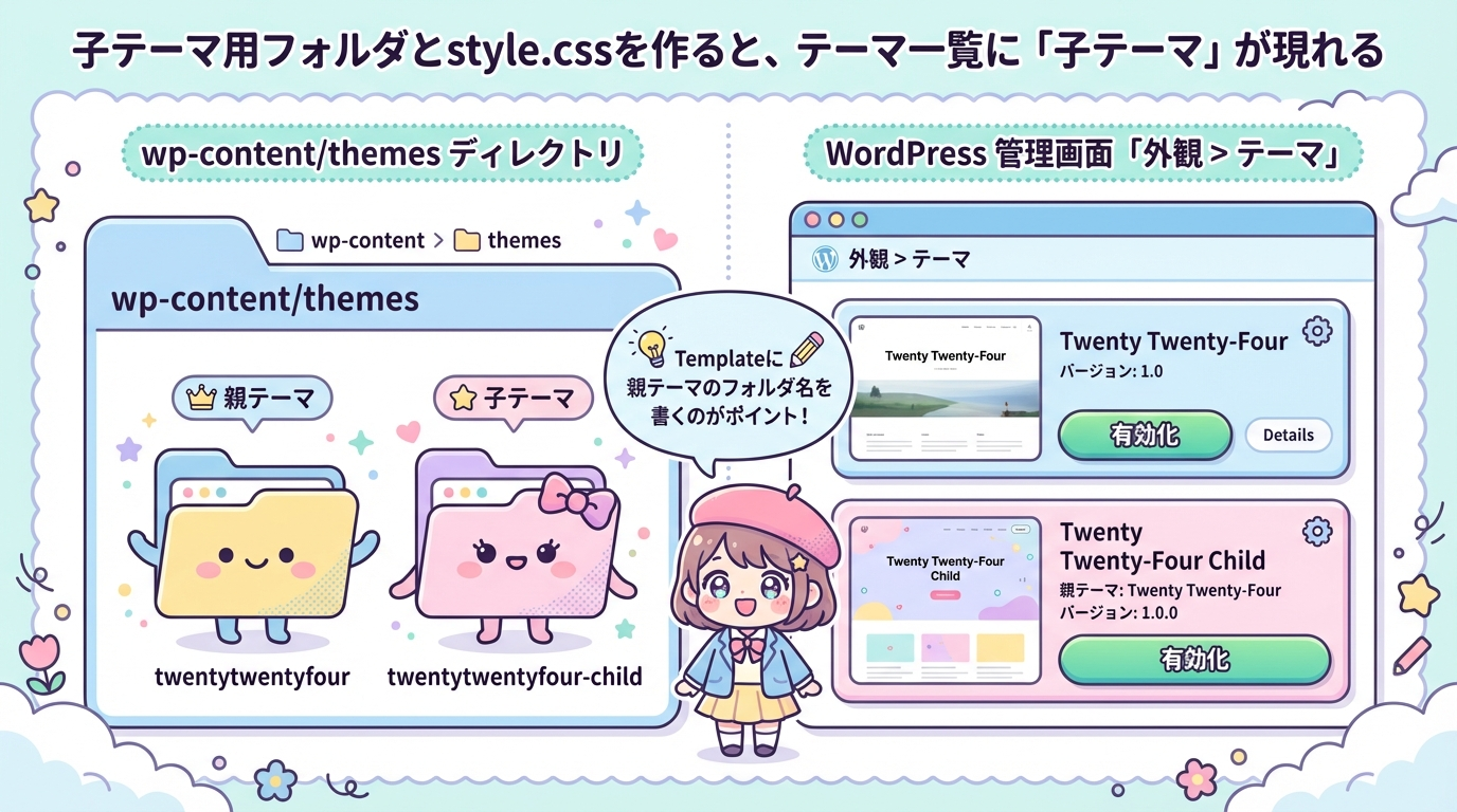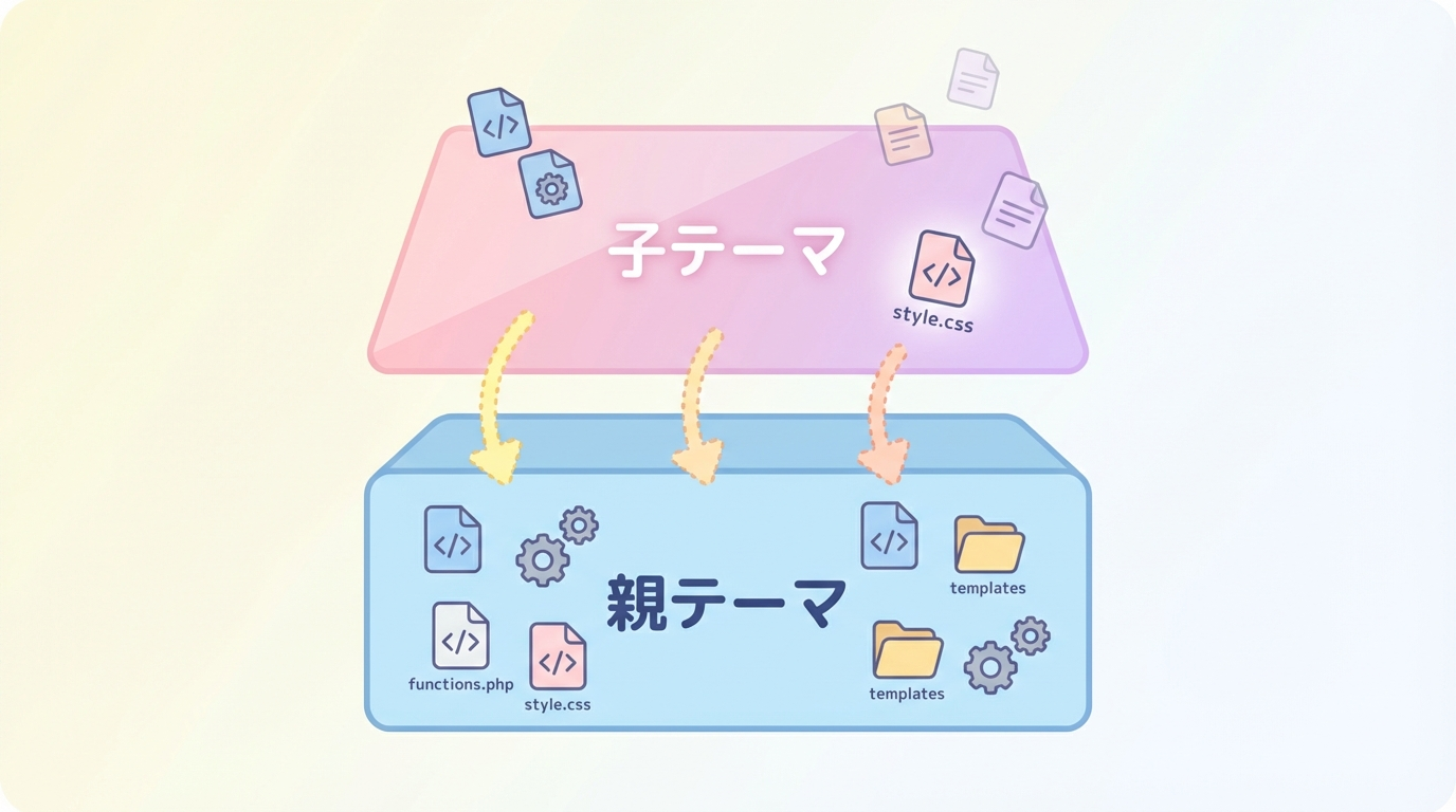 「子テーマ」は、既存のテーマ(=親テーマ)を土台にして、その上に自分のカスタマイズだけを載せるための“上乗せテーマ”です。