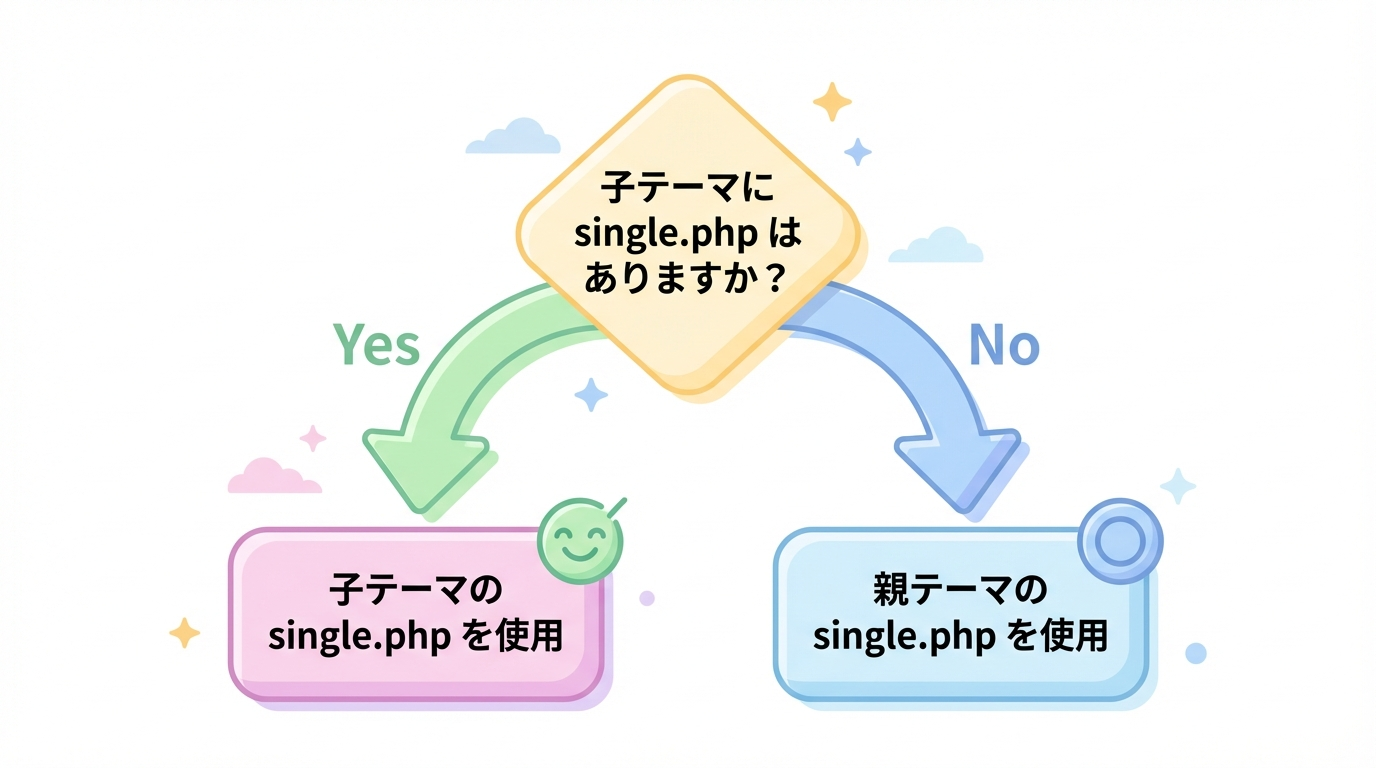 → この場合は、再び親テーマ側のsingle.phpの内容が使われます