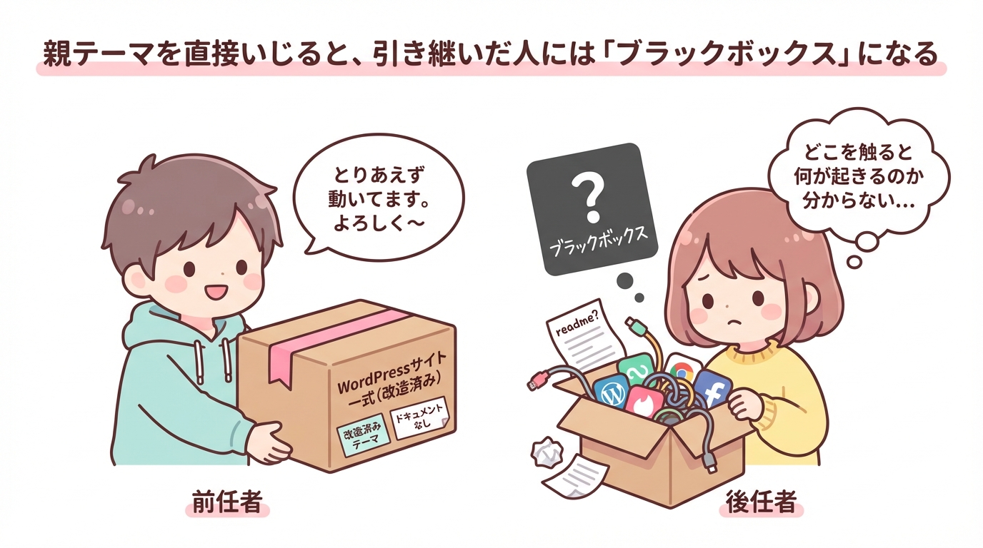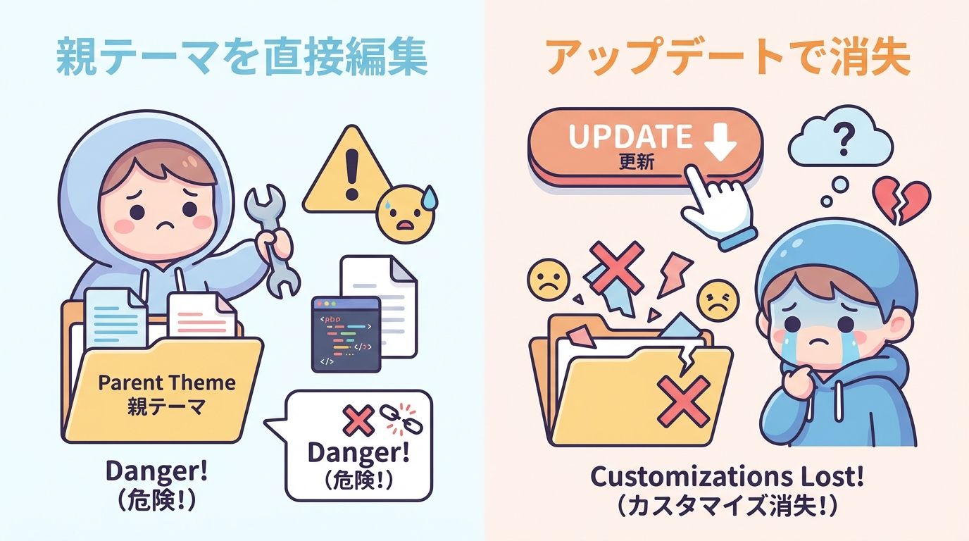 子テーマの話に入る前に、「そもそも親テーマを直接いじると何がまずいのか」をはっきりさせておきます。ここを押さえておくと、「子テーマを使う必然性」が腑に落ちます。