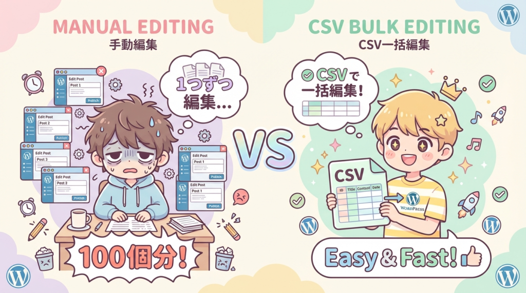 1つずつ記事を開いて修正するのはとても時間がかかりますが、CSV(シーエスブイ) というデータ形式を使えば、これらの作業を一瞬で終わらせることができます。