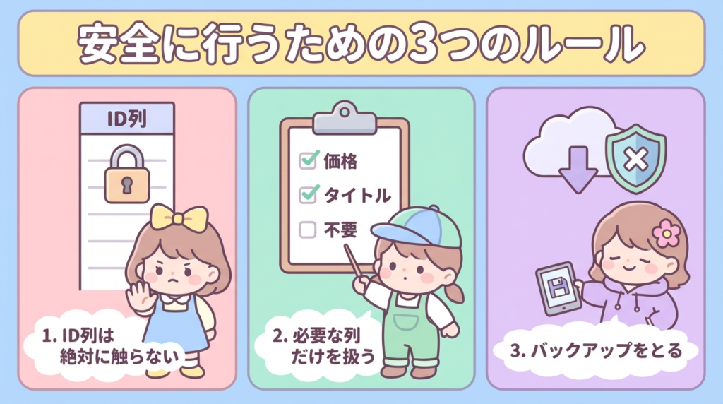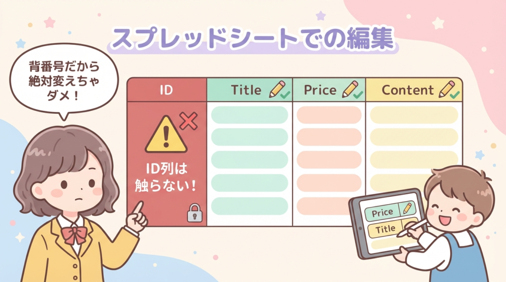 ID は記事の「背番号」です。ここが変わると上書きできません。 - 必要な列だけを扱う